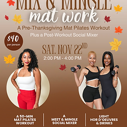 Join us for a Pre-Thanksgiving Mat Pilates experience that blends movement, mindfulness, and community! Kick off the holiday weekend with a 50-minute Mat Pilates workout designed to strengthen, lengthen, and tone your body...followed by a post-workout social mixer with light hors d’oeuvres and drinks. This event is perfect for anyone looking to unwind, connect, and get in a great workout before the holiday rush. Come move, mingle, and meet other fitness lovers in a fun, supportive space! - Saturday, November 22nd - 2:00 PM - 4:00 PM - Passport Fitness | 10999 Red Run Blvd, Ste 100, Owings Mills, MD 21117 - $40 per person - Bring your own Mat!
